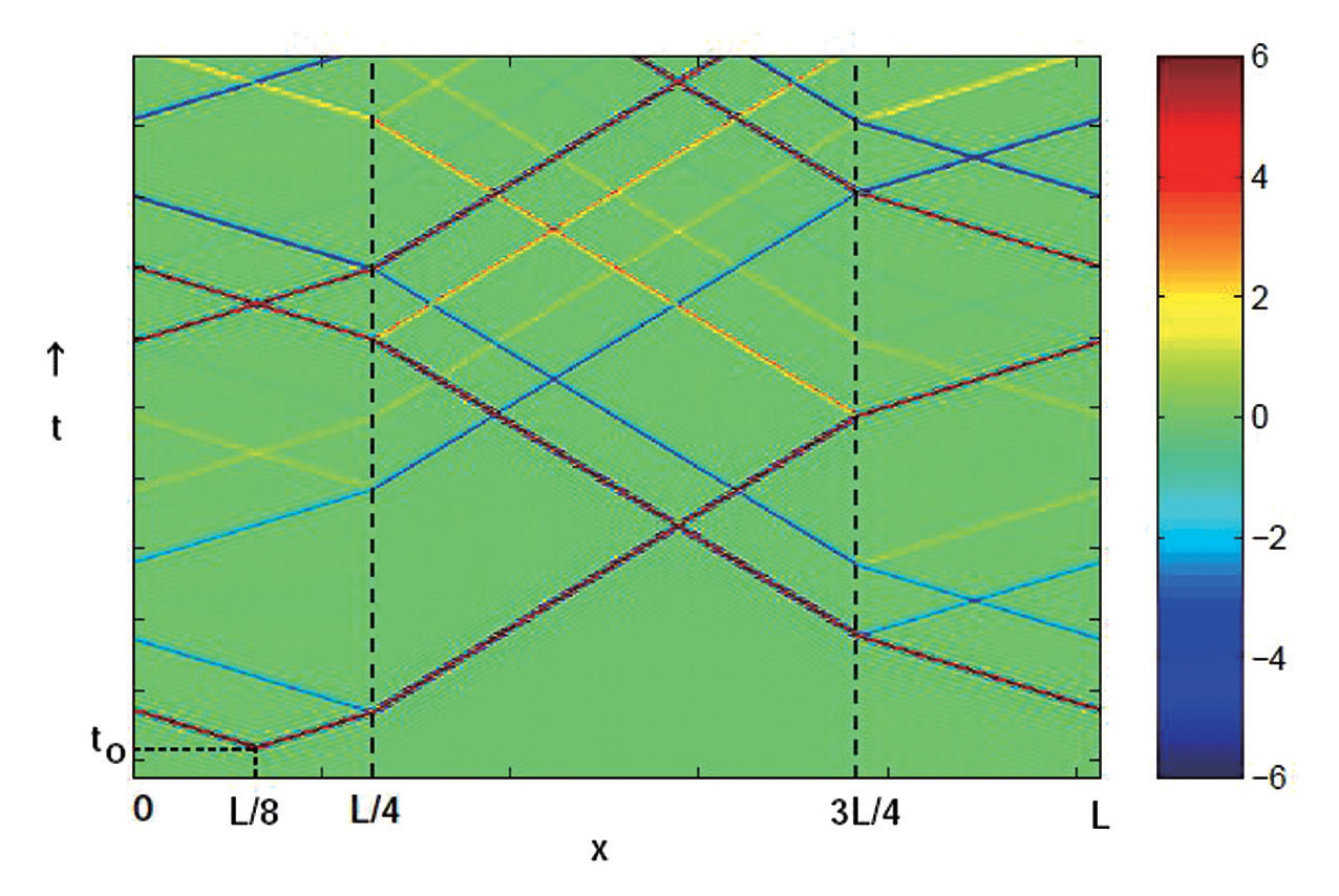 図は本手法を用いて1次元弾性体における粒子速度の走時曲線を示したものである。長さLの1次元不均質媒質で、位置x=L/4およびx=3L/4に不連続を置き、x=0,Lに周期的境界条件を与えた。波動の励起にはt=t0、x=L/8において撃力を与えている。不連続点における反射および屈折が観察され、時間が十分に経過してもグリッド分散のない波動場が得られた。また、不連続点での応力の連続も確認し、数値的に得られる解析解と十分な精度で一致することを検証した。